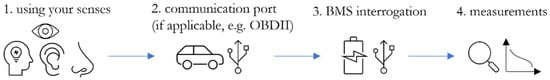 Considering regular ICE vehicles, the OBDII-port sure is the main data access point to the vehicle’s system network. Regulations force ICE vehicles to have such a port, making several emission-related checks possible as well as an eased maintenance by storing error-codes or actuator states, which is intensively used by car repair workshops or during regular technical inspections. However, there is no binding regulation to date that forces EVs to come equipped with an OBDII-port, although some manufacturers supply their models with this port. This is especially the case for (P)HEV-vehicles [23,40,41]. Even if an electrified vehicle was equipped with the port, the information exchange would not be covered by a regulation and, therefore, the vehicle manufacturers can implement proprietary solutions, including either special reading tools or limited functionality in terms of information disclosed, or both. For example, Toyota, Lexus, Nissan or Chevrolet equip some models with OBDII-ports and enable customers to connect to it, to take a look at some limited parameters of its battery (e.g., voltage, temperature, SoC). However, the main purpose of this data supply can be considered as an “entertaining” feature. In addition, a proprietary application is required, and the information is not evaluated in terms of safety. Other electrified vehicles offer the OBDII-port access with common diagnostic tools, but limit the information available [42,43,44]. Nevertheless, if an OBDII-port is available, including relevant data traffic, this sure is the most straightforward and preferable physical access to BMS-originated information.
