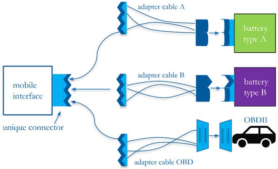 Mobile interface—concept of physical connection: with respective adapter cables, the mobile interface can be universally applied to a variety of battery models as well as directly connected to the OBDII port.