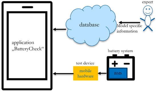 Like the battery-data related OBDII-communication, the BMS-communication is not standardized either, which affects the communication protocol as well as the physical access (connections or plugs). Thus, the developed mobile interface is implemented in an expandable way and is based on a central database/backend concept. It enables a versatile application for multiple brands and types of batteries. In addition, the operation of the mobile interface can be learned intuitively and is therefore easy to apply even for non-expert users, which enables, i.e., employees of waste management companies, transport or towing companies as well as rescue forces such as firefighters to make an assessment on site, for the sake of safely handling it for a short time. Besides this concept of connecting the mobile interface to the existing BMS-datalink, it is also possible to expand the application towards full vehicles, where an OBDII-connector could be used for connection. Figure 3 shows the connection principle, which can be adapted to different types of batteries.