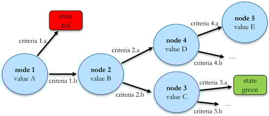 Another key part of the state assessment is the algorithm according to which the data are to be evaluated (step c). This information is—as mentioned above—also vehicle/model specific and must be stored for the respective model in addition to the decryption data. The evaluation rule is implemented in the form of a decision tree, where each node corresponds to a battery relevant information (e.g., current value, overall voltage, battery temperature, etc.). Depending on their value, a decision is then made, which results either in a jump to another node or the end of the calculation, i.e., a final state estimation. Figure 7 shows the principle of data evaluation.