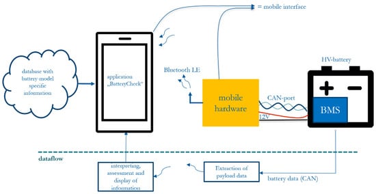 Considering the case of a battery whose data are to be read from the BMS, an appropriate adapter cable must be used, which allows for connection to the mobile hardware on one side. The battery-side requires the matching plug of the connector assembled in the battery. With the proper pin assignment—which must be known for the connection—the corresponding data lines can then be adapted to the data channel pin-assignment of the mobile hardware. Consequently, the task of preparing adapter cables with the correct wiring must be conducted only once, whereas it shall be mentioned that a standardized connection to the battery’s BMS would ease this process a lot. In current vehicles, this communication channel is mainly CAN–bus based [50], meaning that the hardware to read and understand the BMS-data must be prepared for that protocol. Hence, Figure 4 illustrates the physical input of data to the mobile interface.