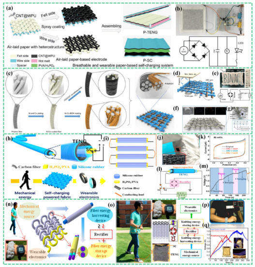 Using woven carbon fiber as the basis, Biplab K. Deka et al., developed a multipurpose TENG-UPS (Figure 6p–r). By developing P-doped Cu-Mn selenide nanowires on the surface, the WCF electrode is improved. The positive electrode of TENG is made of the polydimethylsiloxane-coated nanowire WCF, while the negative electrode is made of the SC’s polyester-based outer surface. The equipment can adapt to various external climatic conditions and has good mechanical performance. The TENG-UPS can be used for various electronic devices, including autonomous cars and unmanned aircraft [88].