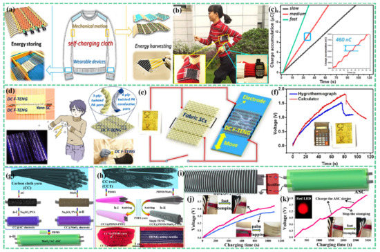 - Dong, K.; Wang, Z.L. Self-charging power textiles integrating energy harvesting triboelectric nanogenerators with energy storage batteries/supercapacitors. J. Semicond. 2021, 42, 101601. [Google Scholar] [CrossRef]