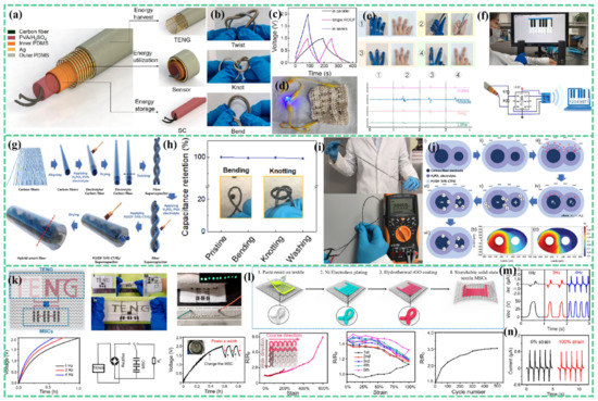 - Han, J.; Xu, C.; Zhang, J.; Xu, N.; Xiong, Y.; Cao, X.; Liang, Y.; Zheng, L.; Sun, J.; Zhai, J. Multifunctional coaxial energy fiber toward energy harvesting, storage, and utilization. ACS Nano 2021, 15, 1597–1607. [Google Scholar] [CrossRef]