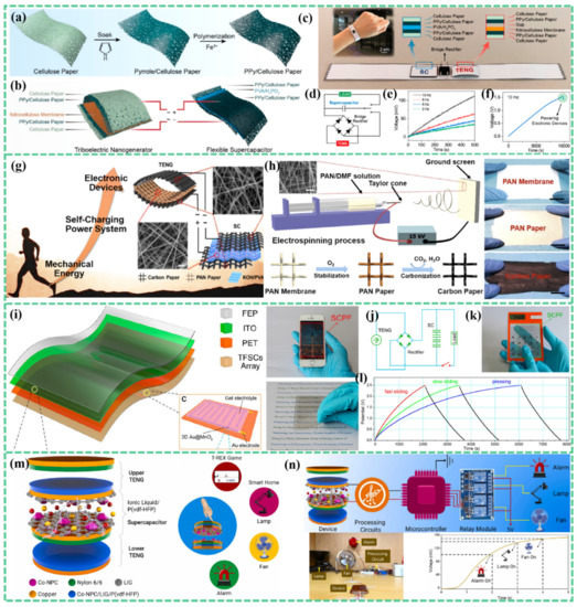 Sun et al., showed an electrostatic spinning paper-based supercapacitor (EP-SC) as an energy storage unit, and a friction electric nanogenerator (EP-TENG) as an energy trap (Figure 5g–h). In the arcuate EP-TENG, conductive carbon paper serves as the electrode, non-conductive pan paper serves as the triboelectric layer, and both conductive carbon paper and non-conductive pan paper are employed as the EP-SC’s capacitive material. Electronic watches and calculators can be powered by using fully flexible electrospinning paper [81]. Additionally, accelerating the transition to transparent, flexible, and portable electronic devices is the development trend of portable wearable personal electronic devices and intelligent security systems. Luo et al., constructed a transparent and flexible self-charging power film (SCPF), which can be used as an information input matrix or a self-energy supply system coupled with an energy storage device (Figure 5i–l). TENG’s electrode was composed of 3DAu-MnO film. Energy storage was completed by all-solid-state interdigital TFSC array. The whole apparatus can harvest mechanical energy from the quick movement of the finger and has a high transmittance of 67.1%. More importantly, the device can identify personal characteristics by capturing electronic data related to bioelectricity, applied pressure, sliding speed, etc., during sliding movement [82]. Additionally, a self-charging SC power cell was recently presented by Kumar Shrestha et al., (Figure 5m,n). In addition to an ionic liquid electrolyte and an electrode made of cobalt nanoporous carbon, laser-induced graphene, and copper (Co NPC/LIG/Cu), the device employs poly (vinylidene fluoride co hexafluoropropylene) P(VDF-HFP) as a polymer separator. The TENG’s positive and negative triboelectric layers are made of nylon 6*6 nanofiber and Co NPC/LIG/P(VDF-HFP) film, respectively. With 2.5 mW power output, TENG can effectively charge SPC to 210 mV in 9 s. To control T-Rex’s “leap” and “duck” motions in the gaming interface, dynamic and static signals from SPC devices are employed, and various SPC charge levels are utilized as smart switches to turn on intelligent appliances [83].