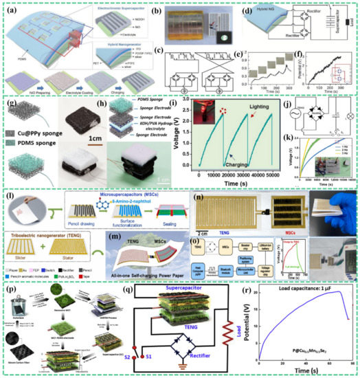 - Song, Y.; Cheng, X.; Chen, H.; Huang, J.; Chen, X.; Han, M.; Su, Z.; Meng, B.; Song, Z.; Zhang, H. Integrated self-charging power unit with flexible supercapacitor and triboelectric nanogenerator. J. Mat. Chem. A 2016, 4, 14298–14306. [Google Scholar] [CrossRef]