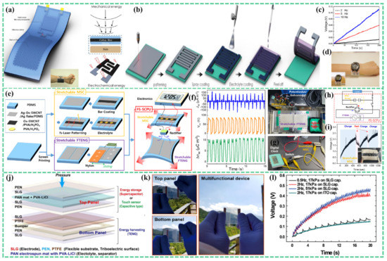 In a wearable, flexible monolithic device, Jiang et al., developed a very compact TENG-UPS that combines an MSC based on Mxene with a TENG (Figure 8a–d). The device can use and store random energy from human actions in standby mode, and when active, it can power electrical devices [92]. Zhou et al., built FC-TENG and FC-SC on the basis of folded carbon (FC) paper, which are, respectively, used as energy collectors and storage devices. This kind of high Young’s modulus carbon paper has geometric design and super tensile property. It can make the power unit work normally even in severe deformation, such as bending, twisting, or rolling. The packaged equipment also performs well in terms of waterproofing. The self-charging unit may successfully charge electrical gadgets by extracting mechanical energy via hand tapping, foot stomping, and arm contact [93]. Yang et al., developed a completely flexible TENG-UPS that integrates MSC with TENG using oxidized single-walled carbon nanotubes and polymer electrodes [94]. In 10,000 tensile test cycles, the completely stretchy MSC with oxidized single-walled carbon nanotube/polyvinyl alcohol electrode demonstrated a double-layer capacitance of 20 mF cm−2 at 0.1 mA cm−2, as well as increased mechanical flexibility and stretchability. Silver nanoparticles embedded with oxidized single-walled carbon nanotubes were used to create a stretchable current collector based on polydimethylsiloxane. Furthermore, the TENG can charge the MSC of the completely extendable TENG-UPS unit from 0 to 2.2 V in 1200 s and power the commercial digital clock for roughly 10 s (Figure 8e–i). Using an integrated TENG-UPS and a touch sensor, Chun et al., suggested a clear and adaptable multi-functional electronic system (Figure 8j–l). For the electrodes of TENG, touch sensors, and SC, they utilized single-layer graphene (SLG) sheets. A separator made of a PVA-LiCl impregnated electrospinning polyacrylonitrile (PAN) pad was inserted between two symmetric SLG electrodes on a polyethylene naphthalate (PEN) substrate to create the first transparent, capacitive, and flexible electronic devices. The device constitutes the top panel of multi-functional electronic equipment and plays a role as a sensitive and fast response touch sensor and a supercapacitor based on electrochemical double-layer capacitor (EDLC) [95].