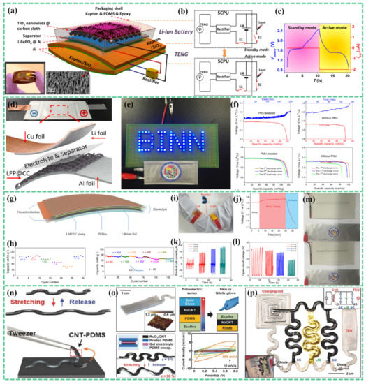 Wang’s research team originally developed the TENG-UPS combined with TENG and LIB, which can concurrently harvest and store ambient mechanical energy (Figure 9a–c). External triggers will cause mechanical movement to generate alternating current, and LIB can be used to store rectified electric energy. In this sustainable mode, TENG-UPS is capable of supplying a constant and long-lasting 2 A direct current that may be utilized to power the UV sensor continually [96]. To store the energy produced by the TENG, Li et al., designed a flexible LIB that resembled a sheet and was constructed of a quasi-solid gel electrolyte (Figure 9d–f). The flexibility of gel electrolyte enables it to withstand various deformations, including bending, twisting, and even being compressed into balls without losing its function. The mechanical strength, flexibility, and puncture resistance of the flexible battery are very good. The flexible LIB stores the rectification energy from TENG, enabling the watch to operate continuously. [97]. Tian et al., reported a FeSe2 carbon nanotube (FeSe2-CNT) hybrid microsphere as the anode material of LIB. FeSe2-CNT hybrid LIB is capable of withstanding high-voltage TENG pulses and can be directly charged by TENG to steadily gather energy [98]. Li et al., developed and built a high-performance flexible lithium-ion battery utilizing LiMn0.6Fe0.4PO4/C(LMFP/C) as the positive electrode material [99]. The battery is very adaptable and recyclable. After 300 bends, there is no discernible performance reduction in the battery. To build a wearable self-charging power pack, a flexible TENG is linked with a flexible battery. TENG can harvest mechanical energy and transfer it to electrical energy, which can then be used to charge the battery and power the flexible electrochromic film. LiMn0.6Fe0.4PO4 is used as the cathode material of flexible lithium-ion batteries and the electrochemical component of self-charging power packs (Figure 9g–m). More intriguingly, Hong et al., designed an energy collection and storage system made up of a wireless power transmission coil, TENG, SC, and LIB (Figure 9n–p). In the combined system, the coil is LIB and SC wireless, while TENG accelerates the charging process. The flexible and elastic structure of the system allows integration with the human skin [100].