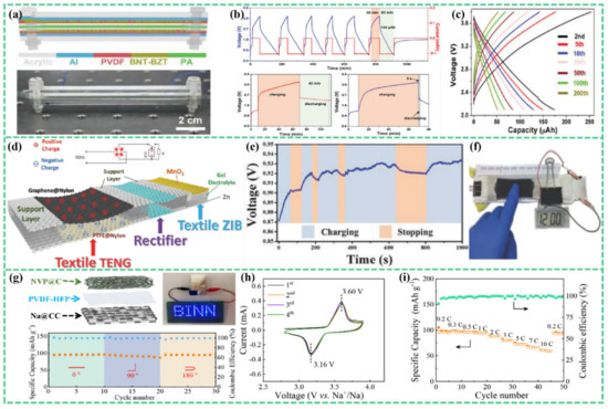 TENG-UPS may also gather mechanical energy from sources other than human motion. For instance, Luo et al., developed a TENG based on a 0.94(Bi0.5Na0.5)TiO3-0.06Ba(0.25Ti0.75)O3/polyvinylidene fluoride (BNT-BZT/PVDF) composite film that was utilized to capture wind energy and employs an all-solid-state lithium-ion battery (ASS-LIB) as an energy storage device (Figure 10a). TENG can provide output voltage and current of 400 V and 45 A respectively. In addition, the ASS-LIB can be quickly charged to 3.8 V in 58 min utilizing wind-driven TENG (Figure 10b,c). It can operate 12 white LEDs in parallel or pH meters constantly [101]. Wang et al., developed a combination of TENG and flexible ZIB integrated in a specifically designed flexible 3D spacer fabric, which can concurrently harvest mechanical energy from human motion and store electrical energy through batteries (Figure 10d). Through the use of external mechanical energy, fabric TENG may produce Voc of around 10-15 V and Isc of 3-4 A. Additionally, the flexible ZIB attained its highest specific capacity of 265 mAh g−1 (Figure 10e,f) [102]. Lu et al., developed a self-powered device that can effectively store pulse current and has excellent cycle stability using flexible quasi solid sodium battery and TENG (Figure 10g–i). The combination of complex and flexible battery and TENG shows its potential as a powerful and flexible self-power supply system and proves its ability as a feasible energy storage component [103].