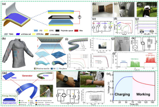 The output power of a single TENG may be limited, which is insufficient to meet consumption of electronic devices in the long run. Combining two or more generators may be a reasonable design, which can effectively collect energy from the environment [104,105,106]. Wen et al., proposed a hybrid TENG-UPS textile in 2016, which can simultaneously collect energy from random body movements and external sunlight. This system then stores the energy in an electrochemical energy storage unit. The charging efficiency of UPST has been significantly increased by using fiber-shaped dye-sensitized solar cells (for solar energy) and fiber-shaped TENG (for random body motion energy). Both of the harvested energies can be easily converted into electrical energy and then further stored as chemical energy in fiber-shaped SCs [107]. Ma et al., constructed a TENG-UPS panel by combining lithium-ion batteries, solar cells, and TENG to immediately store the gathered energy and minimize excessive energy loss (Figure 11a). The utilization of current collectors, substrates, and packing materials is considerably reduced in integrated devices. TENG can charge the 2.1 mA h lithium-ion battery from 3 V to 3.6 V, while the solar cell can charge the battery to 3.86 V (Figure 10b–g). Compared with the case where only solar cells are used, the performance of the hybrid equipment has been significantly improved [108]. Similar to this, Xiong et al., developed a TENG fabric with grating structure and integrated fiber optic dye-sensitized solar cells into their textile-based energy harvesting system (Figure 11h–l). As complimentary power sources, FDSSCs and TENG textiles are included in a piece of clothing. These power sources are employed to gather energy from sunlight and human motion, which is then further stored as chemical energy in LIB [109]. Song et al., developed a flexible dye-sensitized solar cell and skillfully built TENG into it (Figure 11m–o). Both the AC energy from the TENG and the DC energy from the solar cell may be simultaneously stored using a supercapacitor. It may efficiently be incorporated into a flexible wristband to power a range of portable electronic devices, including temperature sensors, LED lights, and electronic timepieces [110].