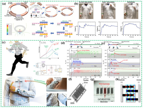 (a,b) A hybrid energy harvesting bracelet combines dual electromagnetic and TENG to harvest wrist movement. (a) The fabrication process and working mechanism of the hybrid energy harvesting bracelet. (b) Photograph and voltage of SCs measured under slow walking, fast walking, and running actuations. Reproduced with permission [111]. Copyright 2019, Wiley-VCH. (c–h) Harvesting of biochemical and biomechanical energy by sweat-based BFC and TENG. (c) Design and concept of the multi-modular energy microgrid system. (d–e) V-t curves under different operating modes. (f) Schematic image of the textile-based SC energy storage module. (g) The photo image of the printed SC module. (h) Charge storage mechanism of hybrid SC cells. Reproduced with permission [112]. Copyright 2018, Wiley-VCH.