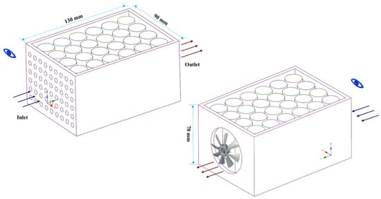 In this work, the commercial CFD software (ANSYS-Fluent) with an in-house written code is employed to simulate the battery thermal behaviour and replicate the temperature distribution across the battery pack. A battery pack with 24 × 18,650 cells was utilised, which uses air cooling BTMS by a fan located at the outlet, shown in Figure 1. The experiments were carried out by Behi. et al. [] under the case with cell spacing of 2 mm and air velocity of 2 m·s−1. The battery pack comprises 24 cylindrical cells in parallel-series connection, and 54 holes (6 rows × 9 columns) were embedded in the inlet surface. The whole battery pack is set as 130 mm × 90 mm × 70 mm, and the diameter of each inlet hole is 5 mm. Besides, the main parameters of the single battery cell, the ventilation fan, and the outer polyvinyl chloride (PVC) case are summarized in Table 1, respectively.