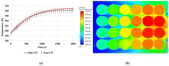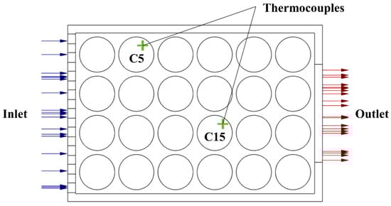 Typically, the cooling performance of the BTMS is evaluated by three index parameters: the maximum temperature, temperature difference and energy consumption []. To validate the numerical results of this work, the experimental data generated by Behi et al. [] is chosen. The simulation configuration is the same as the experiment setup, which consists of a 24 cells battery pack, a PVC case, and a cooling fan, as shown in Figure 1. The testing point of the K-type thermocouple is designated at the specific position, which is the position of cell 5 (C5) and cell 15 (C15), as shown in Figure 2.