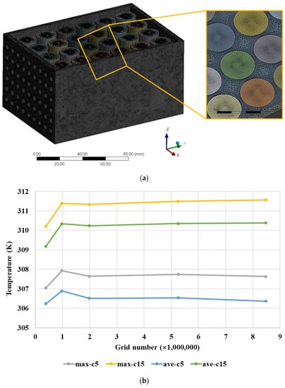 To achieve a credible CFD solution, mesh independence analysis is required to quantify the numerical errors and uncertainties. Based on the experimental layout, the geometry of the whole battery pack was built, and the computational region was mapped by an unstructured mesh, shown in Figure 3a. The maximum volume temperature and the surface weighted average temperature specified by C5 and C15 under various mesh element sizes to evaluate the mesh independence were illustrated in Figure 3b. Compared to the different grid size and element numbers, it is observed that the maximum volume temperature and the surface weighted average temperature of both cells stabilizes when the grid amount reaches 1.99 million. Hence, the medium element number of 1.99 million grids is applied for this battery pack simulation.