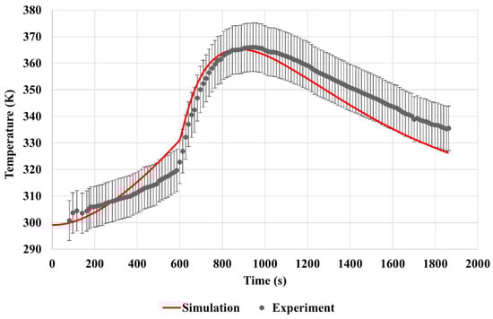 In this case, the abnormal heat generation is applied, and the neighboring cell temperature is calculated and compared with the experimental data extracted from Lopez. et al. []. The comparison results between the numerical and experimental data are demonstrated in Figure 6, indicating a satisfactory agreement. The error of the maximum temperature for the neighboring cell is less than 1 K. Therefore, this case can be further expanded to analyze the heat transfer mechanism under the abnormal heat generation scenarios.
