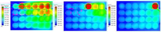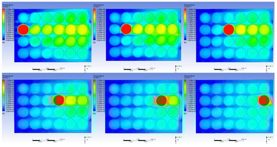 With the application of the in-house written user-defined function code, abnormal heat generation can be applied to the battery pack directly. The comparison of the various locations along the same row can be observed. For Row 2, the abnormal heat generation was applied from C2 (the nearest cell located to the air inlet) to C22 (the nearest cell located to the air outlet). The temperature distribution is shown in Figure 7. The applied abnormal heat generation was controlled as a thermal runaway in a single cell, but the heat did not trigger the thermal runaway of adjacent cells. The heat propagation has shown that the abnormal heat was transferred to the adjacent cell most along the longitudinal direction due to the forced-air cooling.