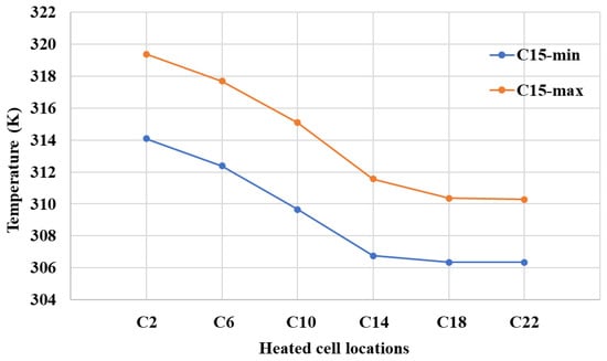 According to the various locations of the thermal runaway cell, the maximum and minimum temperatures of C15 were compared and demonstrated in Figure 8. C15 is the cell in the same column as C14 and is also in Row 3. It can be concluded that the temperature of C15 was stabilized since the thermal runaway cell moved downstream of itself. Also, both the maximum and minimum temperatures increased by 9.1 K and 7.7 K, respectively, which illustrates that when abnormal heat is generated, or thermal runaway occurs, at the early stage, which is before the thermal runaway is triggered of adjacent cells, the increasing temperature is due to the fact that the cooling air was heated up and the cooling efficiency was reduced. Compared to cases C2 and C22, the maximum temperature was increased by 2.93%, and the minimum temperature was increased by 2.52%.