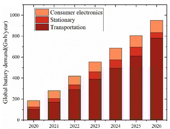 On the background of energy crisis and global warming, applications such as renewable energy systems and new energy vehicles (Electric Vehicles (EVs) and Hybrid EVs) have become a necessary way of saving energy and decreasing carbon emission [,]. As the key component in the power supply of the EVs and Renewable Energy Systems(RESs) [,,], the energy management of the battery pack directly affects its performance in various operation conditions [,]. Due to its high energy density, long service life, no memory effect, etc. [,], the Lithium-ion (Li-ion) battery has become a first choice for EVs and RESs []. For example, lithium iron phosphate (LFP) has a 90~140 Wh/kg energy density and up to 2000 life cycles, which usually consists of LiFePO4 cathode and graphite anode. In addition, Li-ion battery chemistries also include lithium Nickel Manganese Cobalt oxide (NMC) and lithium Nickel Cobalt Aluminum oxide (NCA) with a higher energy density (140~250 Wh/kg) []. Recently, battery manufacturers have also developed new products with relatively superior performance, such as the blade battery (LFP) from BYD which has good thermal safety characteristics through nail penetration tests []. Thanks to its excellent properties, the scope of Li-ion batteries has also expanded to various areas like robots, Automated Guided Vehicles (AGVs) and consumer electronics. Especially, with the concept of low carbon, Li-ion batteries will play an important role in the future. According to Research and Markets research data in Statista [], the global lithium-ion battery scales to about 185 GWh in 2020, and the market is expected to grow to 950 GWh in 2026 as shown in Figure 1.