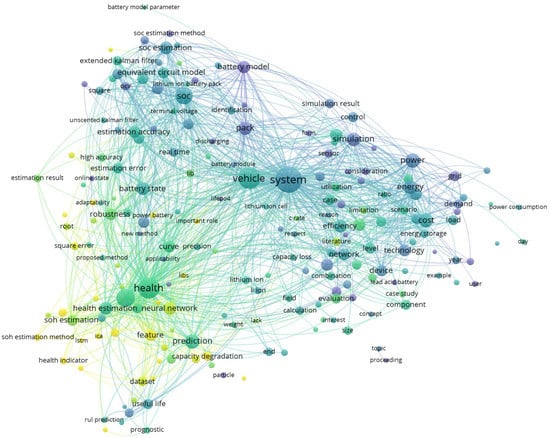 Great efforts have been made to obtain an accurate battery capacity in the literature, as shown in Figure 3. The points shown in the graph are the phrases that appear more than 20 times. The results of the high-frequency word analysis show a strong correlation between the battery capacity and the EVs. After analyzing the results, battery capacity is often used as an additional result for SOC estimation, or as a representation of energy and working efficiency. With the current market expansion and safety requirements, the battery capacity has become extremely important for battery health. From the analysis rules that brighter the node color means a more recent research period, the study of battery capacity has totally become a hot area with the keywords related to battery health all existing in brighter color. In the past, most works related to BMS focused on battery SOC [,]. With the wide application of EVs and RESs, the battery State-Of-Health (SOH), capacity, safety and Remaining Useful Life (RUL) are becoming the points of discussion. We have to mention that more than 500 articles have been investigated from 2016 to 2021; all related to battery capacity.