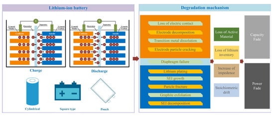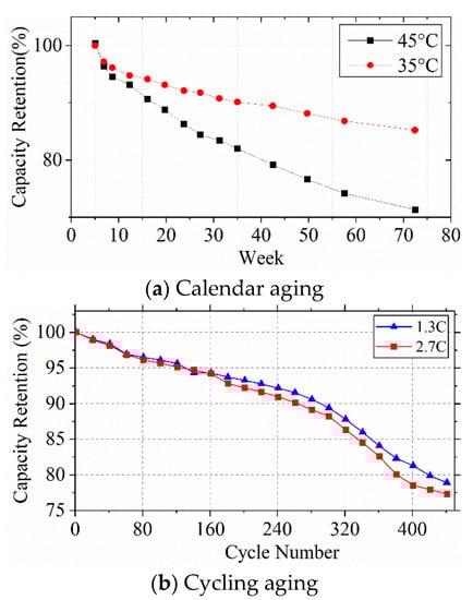 An Li-ion battery mainly contains the lithium metal oxide as the cathode, and graphite as the anode material at present. A separator exists between the two electrodes for insulation, which only allows the pass of Li-ions, and the electrons can only exchange through external circuits. Additionally, an electrolyte is also needed to assist the transfer of Li-ion. Thus, it is clear that the Li-ions exchange from the electrodes during battery charging and discharging []. For EVs, the reduction of the battery capacity results in less energy available, which directly reflects the performance degradation of the battery pack. The capacity loss of the battery is a non-linear process containing complex aging mechanism. However, the aging mechanism of batteries cannot be precisely described, especially for the decay rules of cycle life. To conveniently analyze the battery degradation, recent research usually divides the battery aging into two main forms: calendar aging and cycling aging [,,,].
