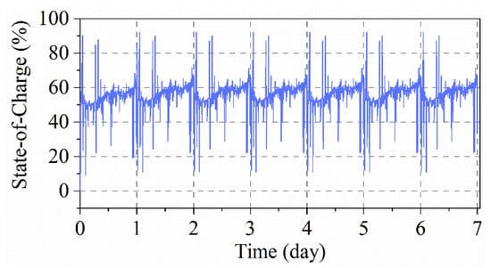 Another concern is that in reality, the BESS cannot always fully charge or discharge in various load conditions. Direct measurement methods cannot give a result if the battery is partially charged or discharged, which often happens in real cases. To clarify this point, an SOC profile of BESS for primary frequency regulation lasting one week [] is shown below in Figure 6. Mostly, the SOC of the BESS varies within 40–60%, which confirms the unrealistic implement of direct measurement methods in a real application. It is noted that fully charging or discharging the battery is also quiet time-consuming [].
