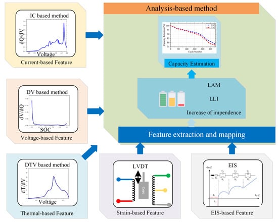 For indirect methods, the voltage, current and temperature can be recorded by sensors, and then used to estimate the capacity. In this work, we mainly introduce five kinds of analysis-based methods with IC (Incremental curve) curve, DV (Differential voltage) curve, DT (Differential thermal) curve, mechanical stress and Electrochemical Impedance Spectroscopy (EIS) as shown Figure 8. At present, more attention is paid to the Li-ion battery capacity. The capacity, which limits the available energy, is the key indicator for State-Of-Health (SOH), which is defined as the ratio of current maximum capacity to its initial capacity [].