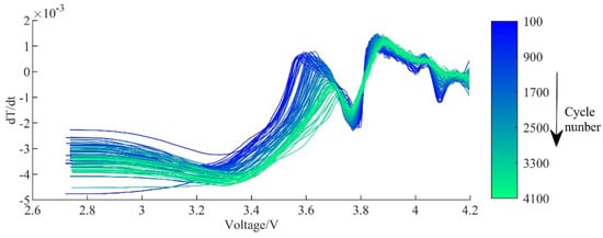 There always is heat generation during the battery operation, which is divided to reversible and irreversible heat. The reversible heat is generated by the entropy change of the electrochemical reaction in electrodes, while irreversible heat is mainly the ohmic resistance heat, polarization heat and the side reactions heat []. Those thermal characteristics are also charged with battery degradation. Therefore, it is possible to use the temperature variation during charge or discharge as the indictor for battery capacity estimation [,,]. Here, we plot the DT curve of the Oxford dataset [] as shown in Figure 9, which indicates a variation on the peak and valley with the increase of the cycling number.