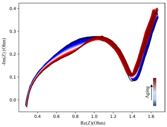 EIS is an effective tool with high sensitivity to the electrochemical reactions inside the Li-ion battery; it has been used for battery modelling [,], SOC and temperature estimation [], and also battery degradation diagnosis [,]. Generally, EIS is measured in the battery equilibrium state with small current or voltage injection in a frequency range between mHz and kHz []. The real and imaginary parts of impedance measurement is selected as the input of a Gaussian Process Regression (GPR) model for Li-ion battery capacity and RUL estimation, in which the variation of EIS with battery degradation is shown in Figure 10. The EIS curve turns from blue to red with battery aging. Ref. [] combines EIS with ultrasonic time-of-flight analysis to investigate the electrochemical characteristics and structure variation inside a Li-ion battery when the cycle number of a battery increases. Refs. [,] extract the parameters of ECM from EIS curve, and then analyze the connections between the parameters and battery aging for estimating the battery capacity. [] uses S transform to a fast calculation of battery impedance, and the zero-crossing point of real impedance R0 is chosen for battery capacity estimation.