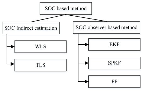 An SOC-based methods can be divided into SOC indirect estimation and the SOC observer-based method, which is illustrated in Figure 11. SOC indirect estimation calculates the battery capacity through a period of Coulomb counting and SOC variation, which usually estimates the battery in a short time scale online. The SOC observer-based method directly estimates the battery capacity utilizing an observer based on battery Equivalent Circuit Model (ECM) model, which uses only current and voltage as the input, and SOC and capacity can be estimated synchronously.