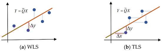 Total Least Squares (TLS): During the calculation of ordinary LS, it assumes that the input data are accurate, but in actual operation process, the input and output data are both influenced by measurement noise. Presented in terms of data fitting, WLS only accounts for , while Total-Least-Squares (TLS) accounts for both and . Therefore, TLS is introduced for capacity estimation, considering the disturbances from both input and output [,]. In this way, the model can be expressed as in Figure 12b, where is the measurement errors and is the input data errors. The TLS problem can be solved by a singular value decomposition of the matrix, but the multiplier of the singular value decomposition of the n × n matrix is 6 []. After analyzing the calculation of TLS, Rhode et al. [] find that it is difficult to derive an analytical solution to the matrix and therefore they propose a recursive form to solve the TLS problem and satisfactory estimation results are finally obtained. Ref. [] uses the constraint Rayleigh quotient as the cost function in the TLS calculation process, which greatly reduces the complexity of the TLS.
