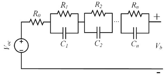 As for the SOC observer-based method, the capacity estimation is developed based on ECMs. The ECMs describe the external characteristics of the Li-ion battery using resistance, capacitance, and voltage source as shown in Figure 13 []. It is believed that the complexity of ECMs is suitable for online BMS applications []. Depending on different numbers n of the RC networks, which describe the dynamic characteristic including the polarization characteristics and diffusion effects [], the Rint model (n = 0), Thevenin model (n = 1), and dual-polarization model (n = 2) are proposed, respectively [].
