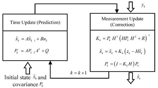 In existing studies, capacity is often considered as one of the parameters to be estimated in parallel with another battery state such as SOC []. This is also known as joint estimation []. Based on the coulomb counting Equation (2), SOC estimation and capacity estimation are coupled. In the joint estimation of SOC–SOH, capacity as a dynamic parameter is treated as an extended state of the filter, and then parametric filtering is performed [,]. For filters, there are two core components, prediction, and correction. Predicting the state from the previous moment and correcting the result based on the observations, the prediction and correction are continuously recursive to complete the estimation of the state. Figure 14 is a schematic diagram of the filtering process using the Kalman filter as an example [,]. The equations for a stochastic linear discrete system are described as: