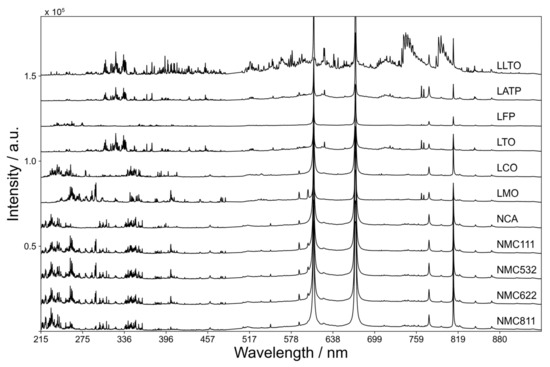 - Smyrek, P.; Zheng, Y.; Rakebrandt, J.-H.; Seifert, H.J.; Pfleging, W. Investigation of Micro-Structured Li(Ni1/3Mn1/3Co1/3)O2 Cathodes by Laser-Induced Breakdown Spectroscopy. In Proceedings of the SPIE LASE, San Francisco, CA, USA, 17 February 2017. [Google Scholar] [CrossRef]