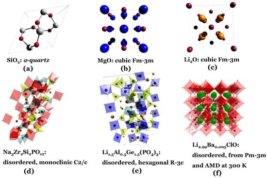 Here, the study of SiO2, MgO, and Li2O dielectric oxides, Na3Zr2Si2PO12, Li1.5Al0.5Ge1.5(PO4)3 and Li2.99Ba0.005ClO solid electrolytes, and a detailed examination of the surface chemical potentials in an Al/insulator/Cu cell was carried out at OCV and in operando. Ab initio simulations were also performed to understand the surface electrical properties of the dielectrics and their role in the cell. The crystal structure of the materials is well known to influence their electronic and electrochemical performance, and so are the properties described in Table 1. In Figure 1, these materials’ crystal structures and space groups are also shown. In the Supplementary Information (SI), the detailed properties of these materials that help identify similarities and differences in their performances in all-solid-state devices, and their actual applications, are discussed.