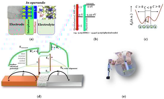 (a) Schematic interplay of the constituents of a battery cell in operando; (b) absolute chemical potentials having as reference the standard hydrogen electrode (SHE) and the vacuum at 0 eV in the physical scale that relates more directly with the work functions of the materials; (c) potential energy showing positive polarization at both interfaces of a cell containing a dielectric. The maximum corresponding to the activation energy, , is a metastable configuration where both ends have equal polarization signs; (d) extended electrode highly resistive cells, where the contact is made difficult by quantum wells/barriers, and each electrode aligns the surface chemical potentials with the dielectric, independently; but, along the cell, there is at least one point for which all the chemical potentials equalize. The latter energy may correspond to the Fermi level or electrochemical potential. The internal contact happens through the electric field, made possible by SPP; (e) photo of a Zn/SiO2/Cu cell used to perform the SKP analysis when connected to a resistor. Note: the Al/insulator/Cu used had Al and Cu tapes connected to the resistor and SKP instrument to avoid additional heterojunctions.