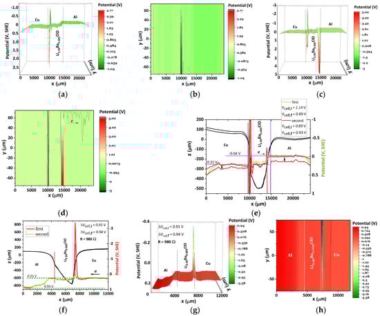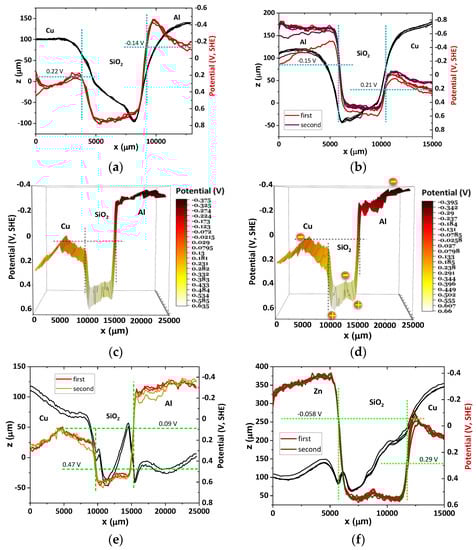 A sharp potential step is shown on both Cu/SiO2 and SiO2/Al heterojunctions, corresponding to internal resistances at the interfaces. These internal resistances are likely to justify the lack of a continuous equalization of surface chemical potentials Cu/SiO2/Al. For example, a heterojunction SiO2/Al equalizes its surface chemical potential with Cu, as shown in Figure 3c–f and represented in Table 2 by Cu…SiO2/Al and Zn/SiO2…Cu1…Cu2. The alignment seems to be more likely to occur at the absolute potential of the Cu, which is expected, as Cu is the electrode more often connected to the SKP.