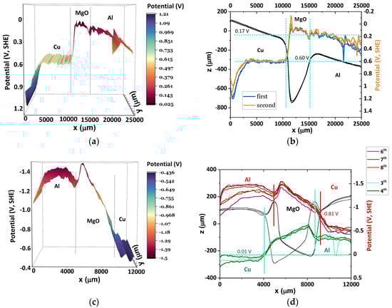 Topography and surface chemical potentials for an Al/MgO/Cu cell show different energies for the equalization of the surface chemical potentials of the heterojunctions Cu/MgO, MgO/Al, and Al/MgO: (a,b) extended SKP analyses showing n-type semiconductor band bending denoted by the surface chemical potential of MgO when Cu was connected to the SKP; equalization of Cu/MgO surface chemical potentials with the Al’s is made through a positively polarized spike at the surface of the Al; (c) straight band bending denoted by the surface chemical potential of MgO when Al is connected to the SKP mirroring (a); (d) SKP analyses showing the differences for when the Al or the Cu are connected to the instrument. The electrode that is connected to the SKP is able to achieve similar surface chemical potentials to the absolute chemical potentials widely available in the literature represented by []; for example, Al reaches −1.45 V (SHE) in (c) for a tabulated value of −1.66 V (SHE) [].