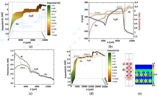 Topography and surface chemical potentials for an Al/Li2O/Cu cell show slightly different energies for the equalization of the surface chemical potentials of the heterojunctions Cu/Li2O and Li2O/Al. (a,b) SKP analysis showing p-type semiconductor band bending of Li2O when Cu was connected to the SKP; (c) p-type band bending observed in the surface potential of Li2O when Al is connected to the SKP showing small interfacial resistance at both interfaces; (d) SKP extended analysis not showing a pronounced p-type semiconductor band bending but rather a flat surface chemical potential of Cu/Li2O with a step toward the Al, reflecting internal interfacial resistance; (e) electron localization function (ELF): isosurface (3D) (ELF = 0.28) and slice (2D) showing delocalized electrons (ELF = 0.50) at the (001) surface of Li2O.