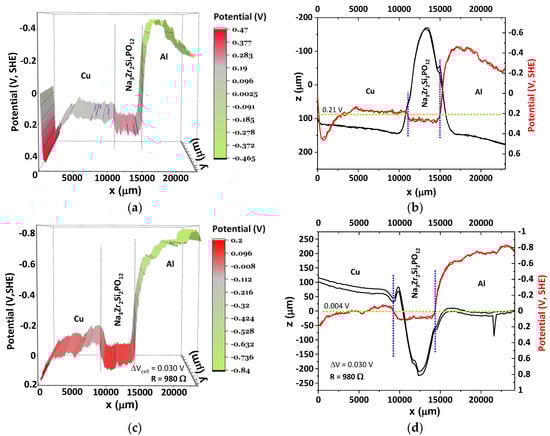 Topography and surface chemical potentials for an Al/Na3Zr2Si2PO12–NASICON/Cu cell show just one energy for the equalization of the surface chemical potentials for both heterojunctions; (a,b) SKP analysis showing a slight tendency from Na3Zr2Si2PO12 to perform as an n-type semiconductor with smooth band bending when Cu was connected to the SKP at OCV; the cell also shows the extreme bending of the Al surface chemical potential towards equalization of the surface chemical potentials not achieved up to 2.4 cm; (c,d) Na3Zr2Si2PO12 p-type band bending while the cell is set to discharge when a 980 Ω resistor was connected closing the circuit. A potential difference of 0.03 V was then obtained between Cu//Al. The difference in surface chemical potentials between OCV and the closed circuit relates to the electrodes bending surface chemical potential, which is much more extreme at OCV; Na3Zr2Si2PO12 behaves as an n-type semiconductor with small band bending towards the Al at OCV and as p-type while set to discharge with the resistor manifested by slight band bending towards the Cu; SKP extended analysis displaying a pronounced interfacial internal resistance at NASICON/Al. We highlight that these experiments were executed at <40 °C, and therefore, the configuration of the cell’s surface chemical potentials at 50 °C—an optimal temperature for the performance of all-solid-state electrolytes in batteries—might differ.