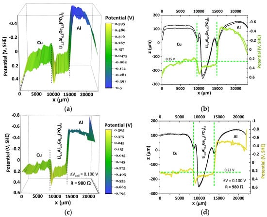 Topography and surface chemical potentials for an Al/Li1.5Al0.5Ge1.5(PO4)3–LAGP/Cu cell show just one energy for the equalization of the surface chemical potentials for both heterojunctions, as observed with Na3Zr2Si2PO12; (a,b) SKP analysis showing clear p-type semiconductor band bending when Cu was connected to the SKP at OCV; they also show the extreme bending of the Al surface chemical potential towards equalization of the surface chemical potentials; (c,d) p-type band bending while almost showing no difference to the OCV configuration when a 980 Ω resistor was connected closing the circuit. A potential difference of 0.1 V was obtained between Cu//Al. The difference between OCV and the closed circuit relates to the electrodes bending. SKP extended analysis displaying a pronounced interfacial internal resistance at LAGP/Al. We highlight that these experiments were executed at <40 °C, and therefore, the configuration of the cell’s surface chemical potentials at 50 °C—an optimal temperature for the performance of all-solid-state electrolytes in batteries—might differ.