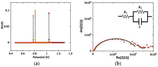 By performing cyclic voltammetry I-V (Figure 9a), it is possible to determine that after the SKP experiment, the cell remains polarized, presenting a current of 0.08 to 0.100 mA, at OCV, and after SKP analyses (0.77 ≤(V) ≤ 1.04). The internal resistance, R2 = 2.2 × 106 Ω (Figure 9b), corresponds to a conductivity through the surface of Li+-glass of 2.4 × 10−7 S·cm−1. It is noteworthy to highlight that semiconductors have conductivities between 10−8 and 102 S·cm−1, and the powders corresponding to a 5.5 mm thick layer of Li2.99Ba0.005ClO had diameters with µm-sizes and were relatively loose in the space between metals; the pressure exerted to contain the powders was manual and made with a spatula-like tool and, therefore, the real conductivity of the Li+-glass surface is much high than measured.