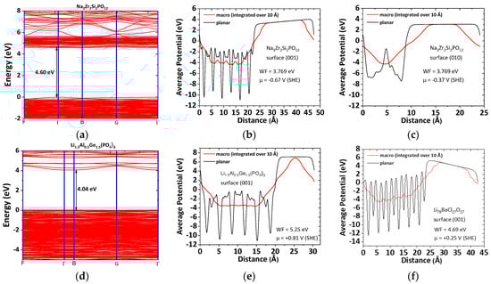 Ab initio: average potentials for solid electrolytes. The macro potentials correspond to integration over 10 Å; average potentials for (001) simulated surfaces and (a) electronic band structure of Na3Zr2Si2PO12 showing a band gap of 4.60 eV, obtained for the bulk superstructure (P1) using DFT; (b) average potentials for the (001) and (010) simulated surfaces of Na3Zr2Si2PO12; (c) electronic band structure of Li1.5Al0.5Ge1.5(PO4)3 showing a band gap of 4.04 eV, obtained for the bulk superstructure (P1) using DFT; average potentials for (001) simulated surface of (d) Na3Zr2Si2PO12; (e) Li1.5Al0.5Ge1.5(PO4)3; (f) Li2.99Ba0.005ClO (Li79BaCl27O27) Note: The (001) surface average potential for Al was obtained in []; the electronic band structures for Na3Zr2Si2PO12 and Li1.5Al0.5Ge1.5(PO4)3 were calculated for triclinic (P1) as these phases are disordered, and therefore have to be simulated in a superstructure although respecting atom positions, cell volume and shape.