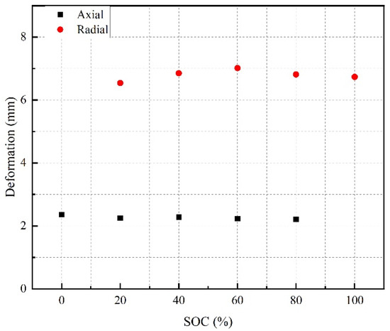 - When the radial residual deformation was less than or equal to 3.36 mm, the battery could undergo normal charging and discharging cycle without safety problems. However, when the axial deformation reached 2.3 mm, the battery failed, and even caused thermal runaway for a high-SOC lithium-ion battery, meaning that the battery was more sensitive to axial deformation.