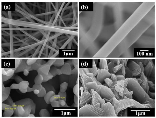 FESEM images of the (a,b) as-spun NaCM-iB nanofibers, (c) NaCM-iB, and (d) NaCM-f composites obtained after high temperature calcination.