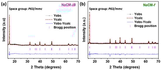 Rietveld-refined patterns of the (a) NaCM-iB and (b) NaCM-f samples.