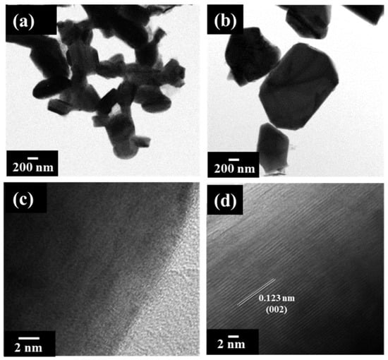 TEM images of the (a) NaCM-iB and (b) NaCM-f, HRTEM images of the (c) NaCM-iB and (d) NaCM-f samples.