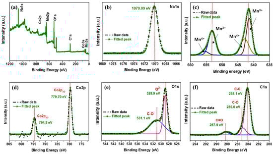 XPS spectra of the NaCM-iB cathode material: (a) survey spectrum and high-resolution (b) Na1s, (c) Mn2p, (d) Co2p, (e) O1s, and (f) C1s spectra.