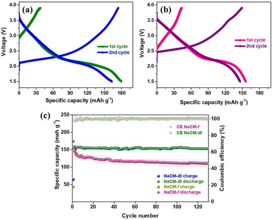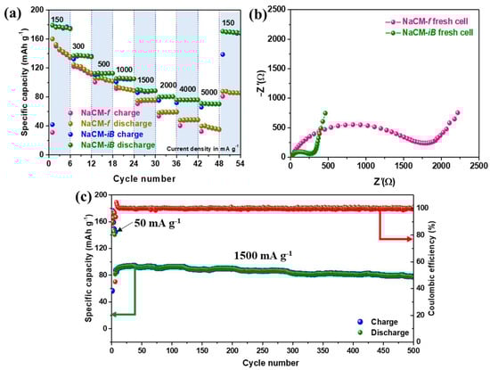 The rate performance of the cathode materials was investigated by sequentially increasing the current rate from 150 mA g−1 to 5000 mA g−1. Figure 7a shows the rate capability tests of both NaCM-iB and NaCM-f vs. Na/Na+. It can be noted that the NaCM-iB cathode exhibited a better rate performance compared to the NaCM-f cathode. At 5000 mA g−1, the NaCM-iB cathode delivered a high capacity of 70 mAh g−1. This exceptional performance of the NaCM-iB cathode can be attributed to the efficient and fast Na+ transport via the 1D cathode structure.