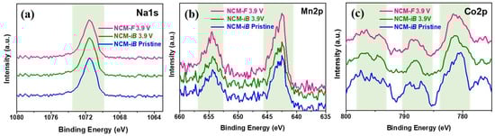 Ex-situ XPS spectra of the NaCM-iB and NaCM-f cathodes: (a) Na1s, (b) Mn2p, and (c) Co2p spectra.