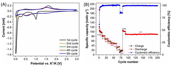 The electrochemical performance of the MoS2 electrode was assessed by galvanostatic charge/discharge cycling, carried out at different current densities ranging from 0.05 to 5 A g−1. The initial specific capacity was 200 mAh g−1 and reached 100–125 mAh g−1 in the first ten cycles, as reported in Figure 1B. The Coulombic efficiency of the first cycle was around 63%, which is similar to the values found in the literature for other PIB anodes [24]; then, it stabilized to 100% in a few cycles.